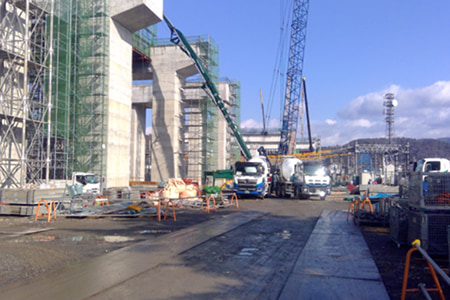 敦賀駅高架橋、新北陸トンネル、芦原温泉駅高架橋など福井県の北陸新幹線工事において生コンクリートの輸送を行いました。各営業所から車両を集結させ、ご依頼を受けて2ヶ月で25台/日稼働できる体制にしました。